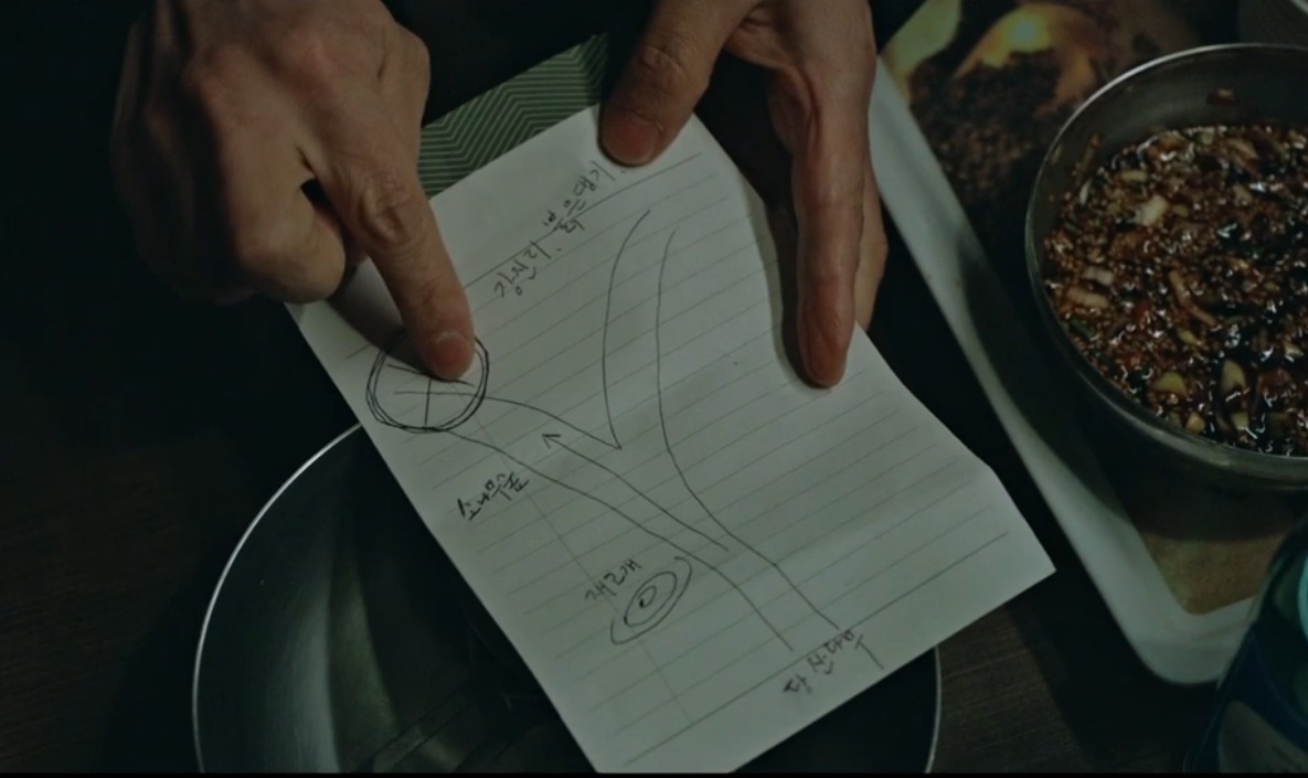 장진리를 알고 있는 할아버지는 동생이 살았기 때문에 자주 갔었다고 한다. 염해상은 그런 할아버지에게 산영이 그렸던 약도를 보여주며 장진리가 맞는지 다시 한번 확인을 한다. 장진리가 맞다고 확인해 주는 할아버지. 그리고 염해상은 약도에서 엑스표시가 된 곳이 어딘지를 묻는다. 그 곳은 덕달이 나무가 있던 자리. '덕'은 어린아이의 시신을 뜻한다.