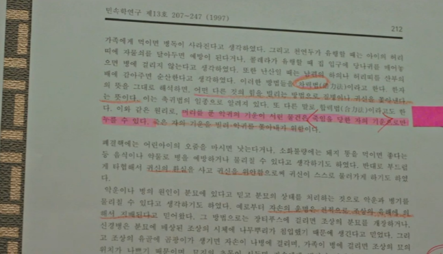염해상은 구강모 교수는 악귀를 제일 잘 알고 있는 사람인데 악귀에 씌었다. 그가 쓴 연구에 해결책이 있을 거라 생각하고 찾아보다. 한 구절을 보게 된다. '머리를 푼 악귀의 기운이 서린 물건은 죽임을 당한 자의 기운으로만 누를 수 있다. 죽은 자의 기운을 빌려 악귀를 쫓아내기 위함이다.'