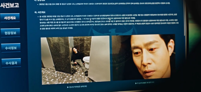 다른 형사들은 범인이 와인바에 있다는 걸 모르니 시간이 있다고 생각한다. 그리고 어제의 일을 생각한다. 범인현장은 여자 화장실. 범행추정시간은 19-22시. 통행인이 많아서 남자가 여자화장실에서 범행을 저지르기엔 심리적 거부감이 큰 시간대라 여자가 범인일 가능성이 높다고 생각한다.