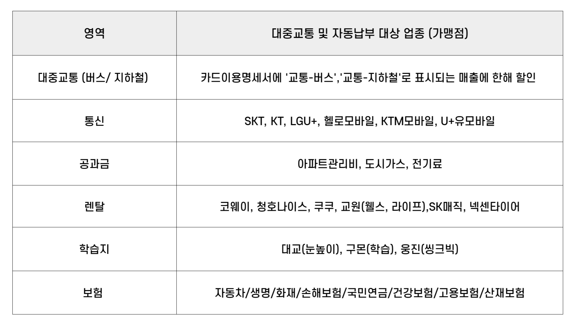 - 통신업종은 휴대전화 요금에 한해, 본 카드로 해당 통신사에 자동납부 신청 후 결제한 건에 대해서만 할인 적용